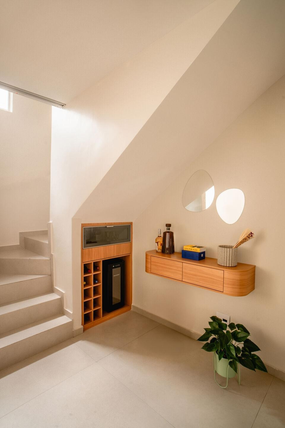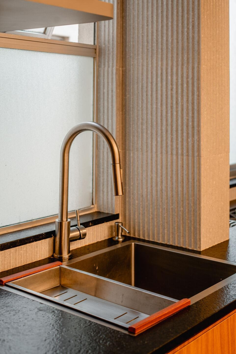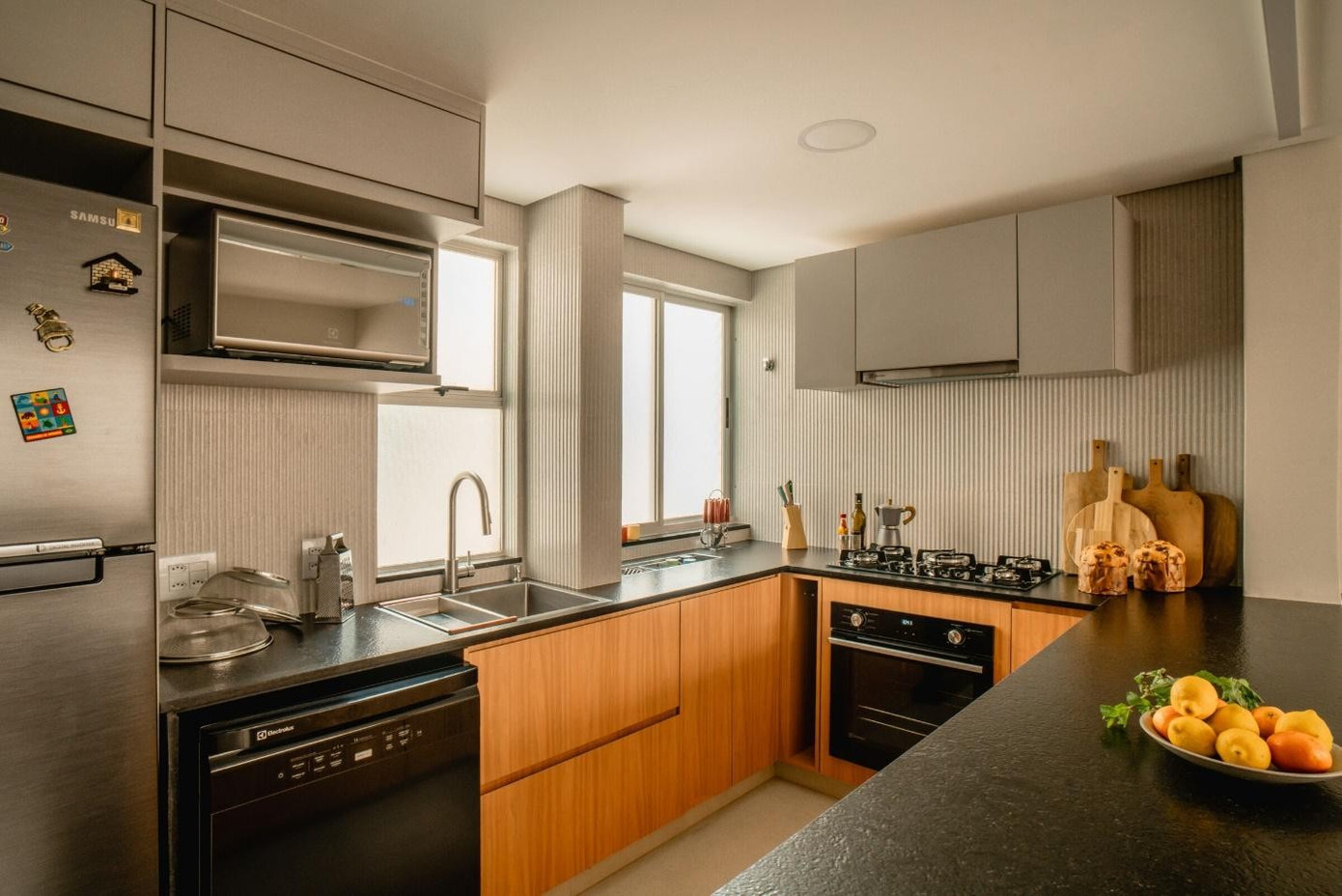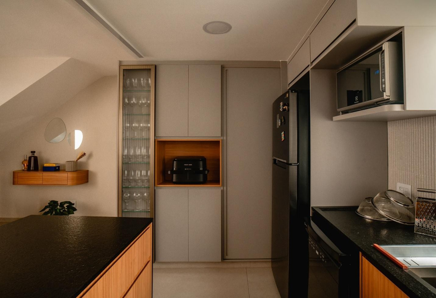 Ngôn ngữ thiết kế hướng đến sự tinh giản nhưng không lạnh lẽo. Hệ tủ gỗ màu xám được thiết kế hẹp để không cản trở lối đi, trong khu không gian lưu trự được mở rộng bằng cách kéo dài dọc theo tường. Giữa bảng màu trung tính, khối tủ gỗ peroba hồng tạo điểm nhấn ấm áp, mang lại cảm giác thân thiện cho khu bếp. Các chi tiết hoàn thiện như bề mặt tường dạng hạt, ốp lam sóng dọc giúp không gian thêm chiều sâu và tương tác tốt hơn với ánh sáng tự nhiên.