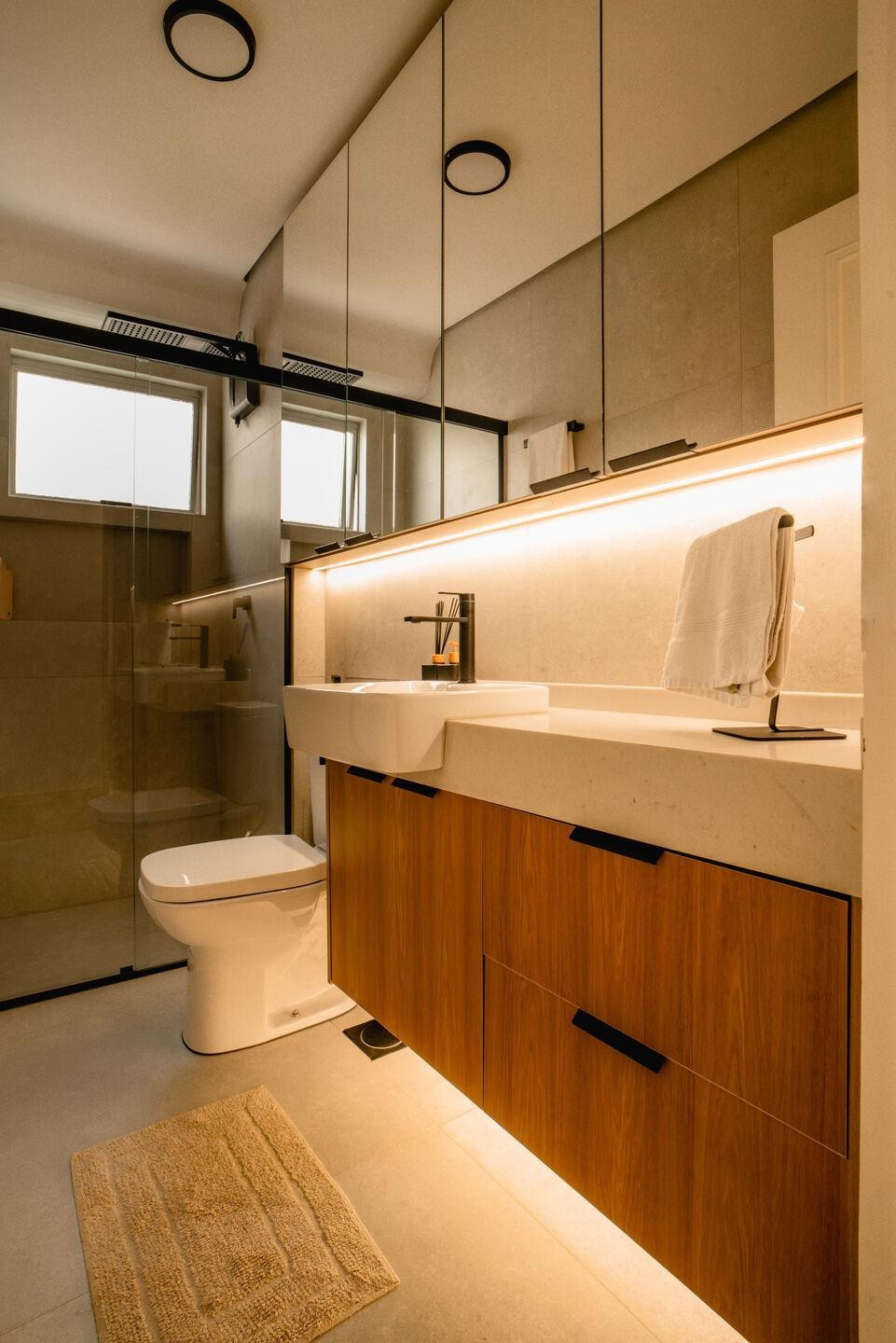 Điểm nhấn xuyên suốt của căn hộ là hệ thống chiếu sáng gián tiếp được tích hợp khéo léo vào hệ tủ và các cấu kiện kiến trúc. Những dải đèn LED âm tạo nên sự liền mạch, dẫn dắt lối đi và làm nổi bật các mặt phẳng tối giản. Ánh sáng không còn chỉ để chiếu sáng, mà trở thành công cụ tổ chức không gian, xoá nhoà ranh giới giữa các khu vực sinh hoạt.