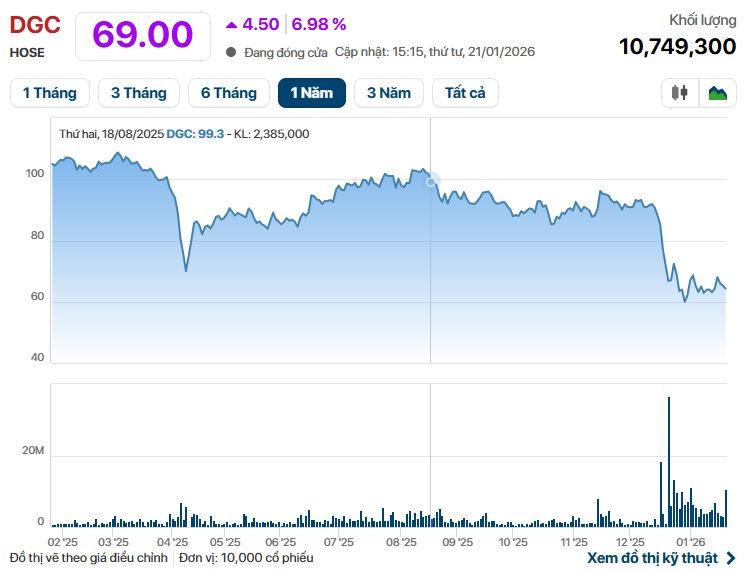 Ngược dòng thị trường chung, cổ phiếu Hóa chất Đức Giang (mã: DGC) bất ngờ tăng kịch trần phiên 21/1, qua đó tiến lên mốc 69.000 đồng/cp. Đây cũng là vùng giá cao nhất trong vòng 1 tháng vừa qua.